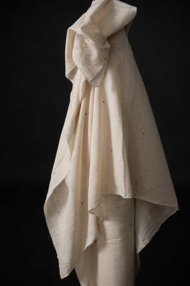 A unique handcrafted Kala cotton in natural ecru with tiny red and blue ditsy flowers woven through using extra weft technique. Extra weft is where additional weft yarns in contrasting colours, are woven through to create a motif. This yarn is woven in with the structural yarns.