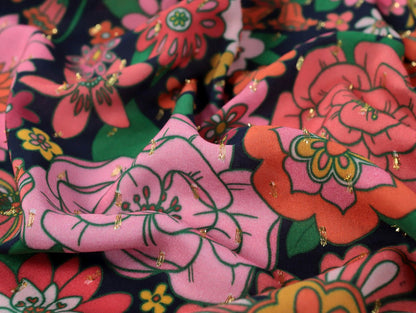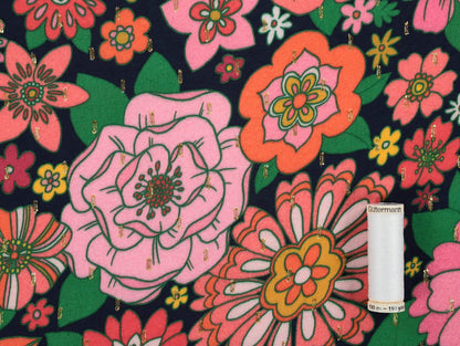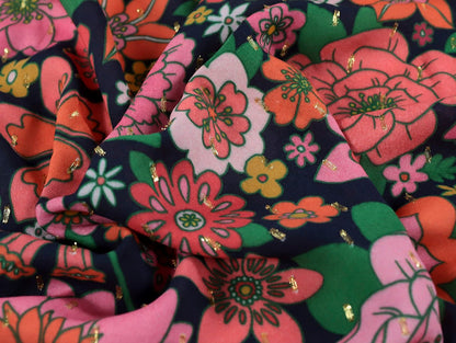 A Fabric Godmother exclusive design. This striking retro floral design, inspired by vintage prints, is printed onto super-soft viscose lawn and accented with gold metallic dobby spots for a touch of added sparkle.