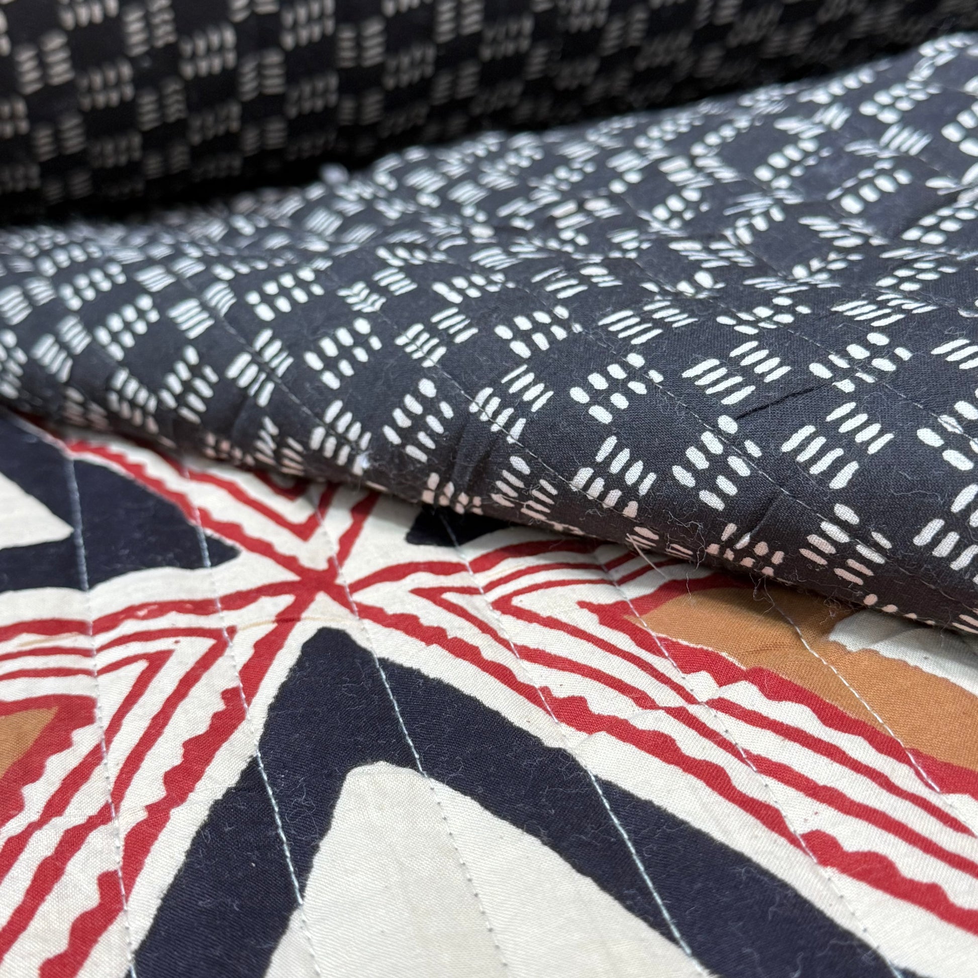 Bring timeless tradition to your sewing projects with our Quilted Bagru Indian Cotton Block Print Fabric. Handcrafted in Rajasthan, India, this fabric combines the beauty of centuries-old block printing with the cozy texture of pre-quilted cotton.